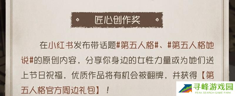 此外,玩家还可以通过小红书活动页面发布带话题#第五人格她说# #第五人格#的原创内容,分享身边的女性力量或为她们送上节日祝福,优质作品将有机会被官方翻牌,并获得《第五人格》官方周边礼包。