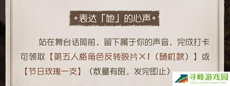 同时,玩家站在舞台话筒前表达“她”的心声,完成打卡后,也能领取《第五人格》角色反转胶片或节日玫瑰一支。