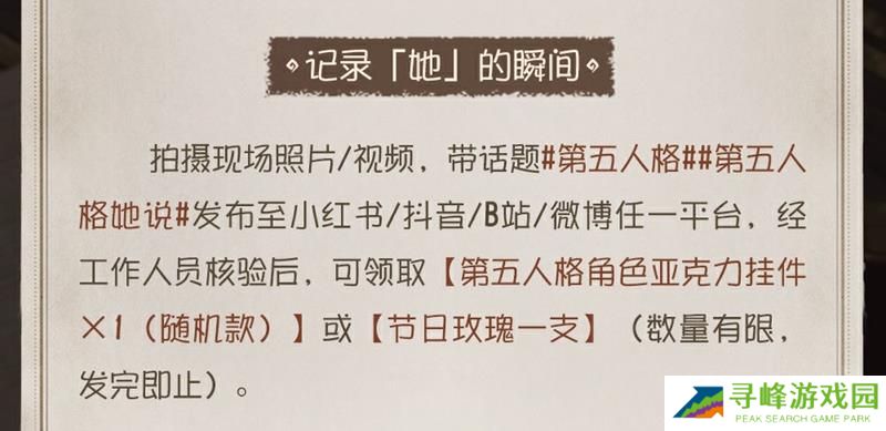 此外,玩家还可以记录“她”的瞬间,拍摄现场照片或视频,并带话题#第五人格# #第五人格她说#发布至小红书、抖音、B站或微博任一平台,经工作人员核验后,可领取《第五人格》角色亚克力挂件或节日玫瑰一支,数量有限,先到先得。