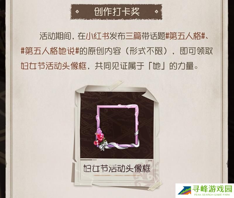 玩家通过小红书活动页面发布三篇带话题#第五人格# #第五人格她说#的原创内容,即可领取妇女节活动头像框,共同见证女性的力量。