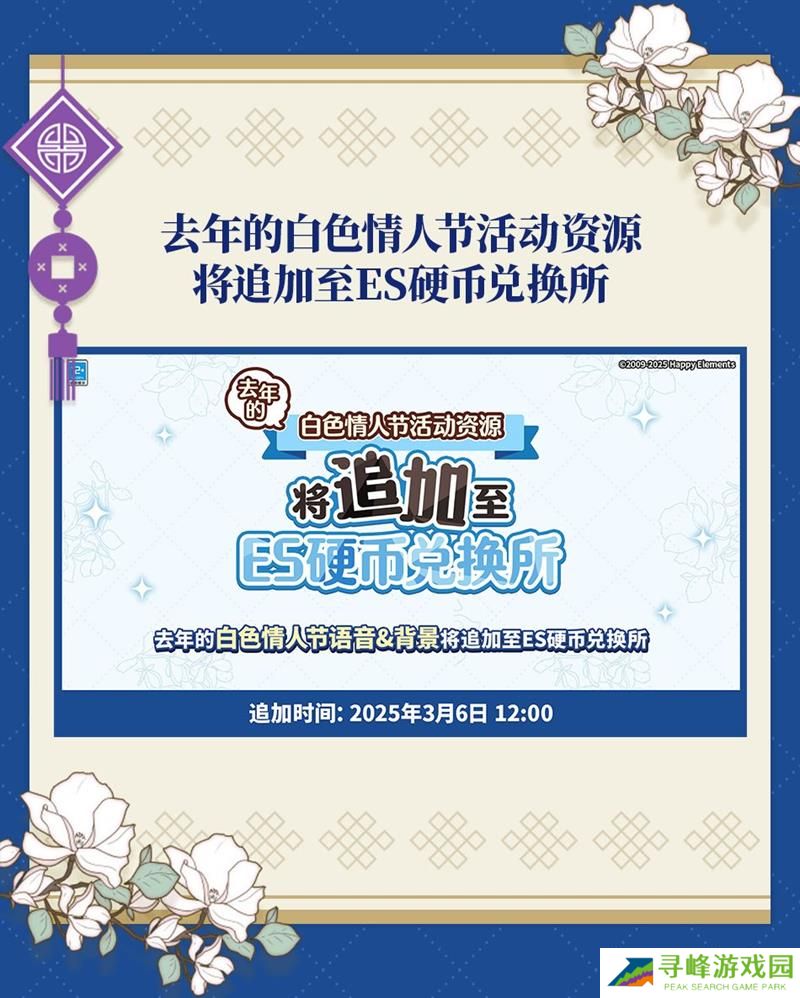 3月6日12:00起,ES硬币兑换所将追加去年的白**人节活动内容语音。