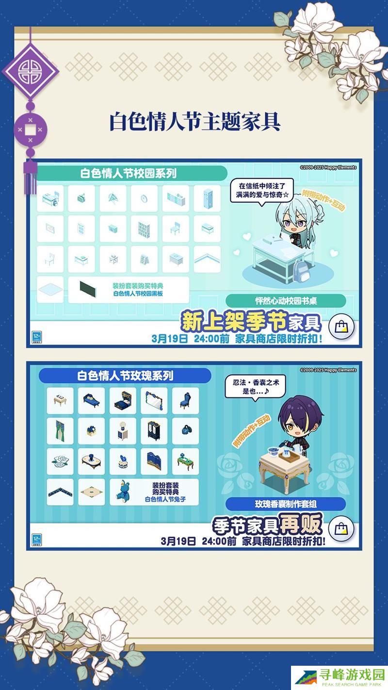 3月6日12:00起,事务所家具商店追加「白**人节校园系列」,限定家具附带动作+互动,同时装扮套装还会获赠特典家具「白**人节校园黑板」,3月19日24:00前家具商店限时折扣。