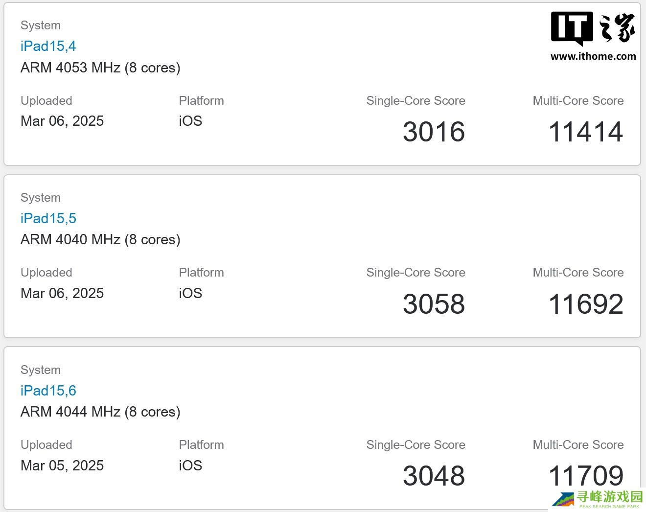 新款 iPad Air 在 Geekbench 6 测试中,共有 3条记录,多核 CPU 平均得分为 11605,相比搭载 M2 芯片的上一代 iPad Air(平均得分 9817)提升了约 18%。本站附上相关图片如下: