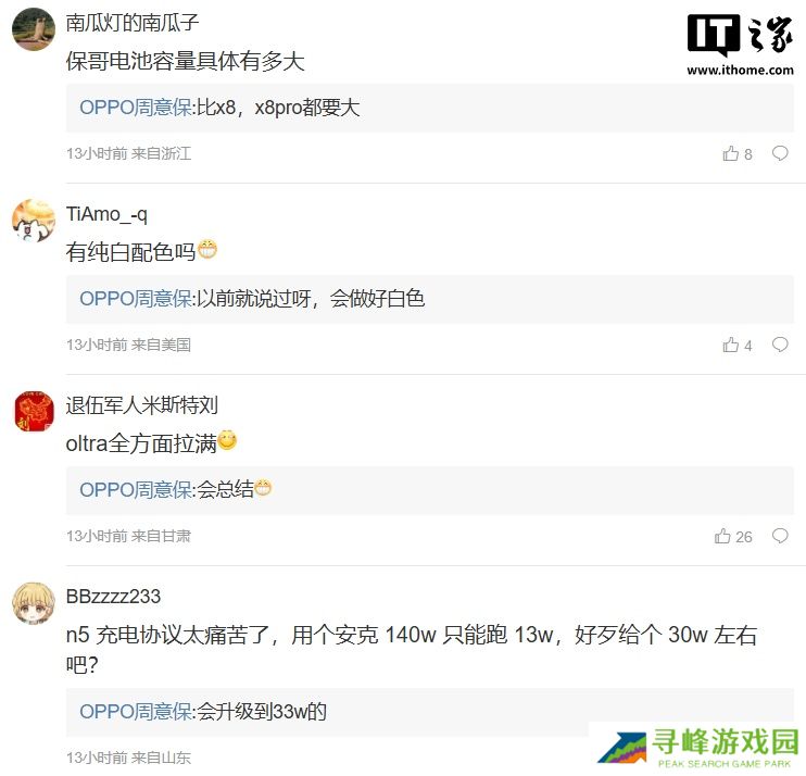 另外,有网友询问新机是否会有白色,周意保称“以前就说过呀,会做好白色”;有网友表示 Find N5 折叠屏手机使用安克 140W充电器只能跑 13W,周意保回复“会升级到 33W 的”。
