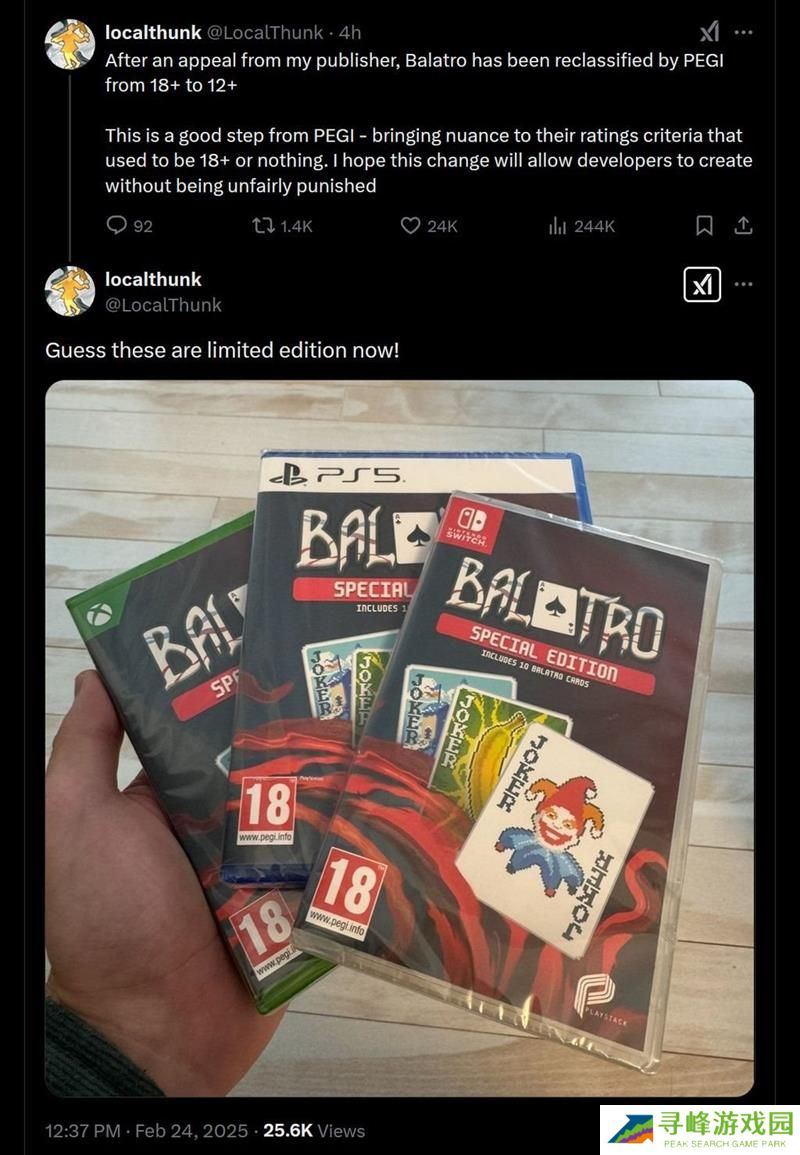 “我更生气的是这些带有实际**机制的儿童游戏被评为 3+,而不是 Balatro 被评为 18+”,LocalThunk 当时写道,“如果这些其他游戏的分级合理,我会欣然接受这个奇怪的 18+。红色的标志看起来还挺酷。”