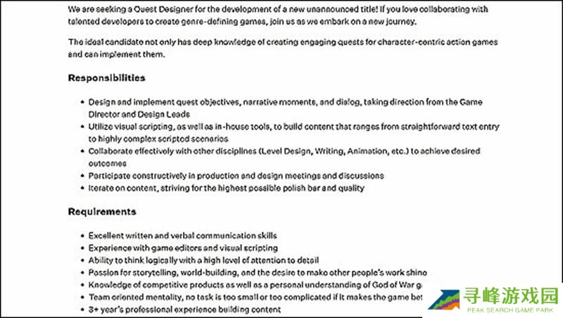 索尼圣莫尼卡工作室在官网发布了两个新职位招聘信息,分别是任务设计师和高级技术叙事设计师。招聘描述中提到,正在寻找一位高级叙事设计师参与一个尚未公开的全新项目开发,并强调了对《战神》系列游戏的个人理解是关键要求之一。