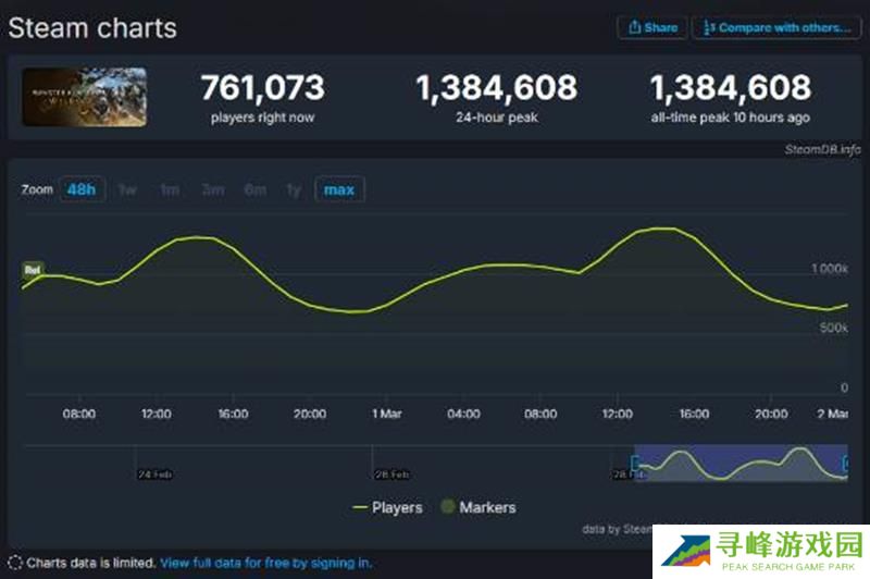 怪物猎人:荒野发售后取得了喜人的成绩,截至发稿前,据SteamDB数据显示,《怪物猎人:荒野》在Steam平台的历史在线人数峰值再创新高,突破140万,仍有超75万名玩家在线!