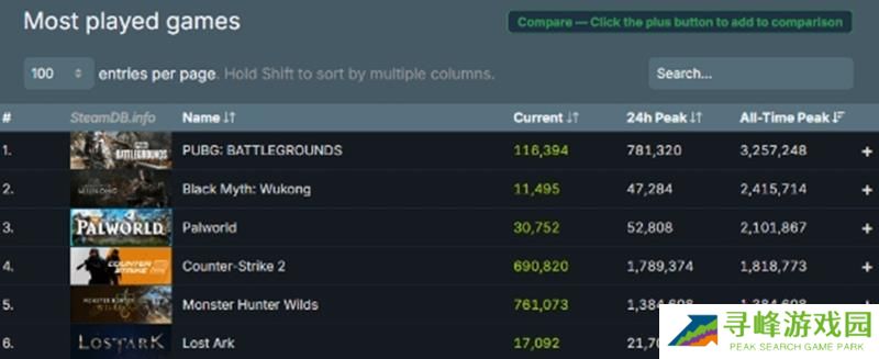 除此之外,《怪物猎人:荒野》已正式超过《失落的方舟》,成为Steam平台历史在线人数峰值游戏榜单排名第五的游戏。