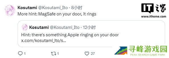 爆料人 Kosutami 今日在 X 平台上发文称:“你的门上可能会有 MagSafe。”他引用了另一条关于苹果传闻中的智能家居门铃的推文,并表示:“提示:苹果的门铃可能会在你的门上响起。”他进一步暗示:“门上的 MagSafe,它会发出声音。”然而,目前尚不清楚 MagSafe 技术在智能门铃中的具体用途。尽管 MagSafe 可能会为门铃的电池充电提供更便捷的体验,但此类设备通常可以在单次充电后使用数月。