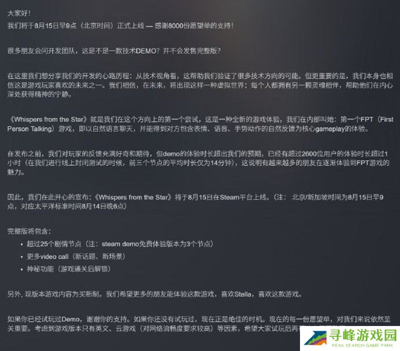 由米哈游创始人蔡浩宇亲自操刀的新作《Whispers from the Star》(以下暂译作《星之低语》)正式公布了发售日期。这款采用AI技术打造的游戏将于8月15日上午9点在Steam平台上线,售价定为9.99美元,折合人民币约72元。值得注意的是,该游戏目前锁国区且仅支持英语语言。