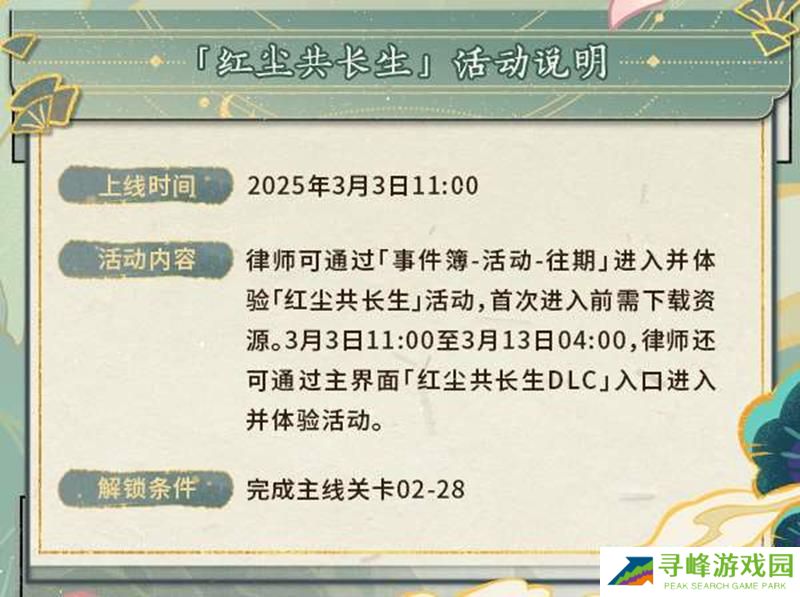 活动内容 律师可通过「事件簿-活动-往期」进入并体验「红尘共长生」活动,首次进入前需下载资源。3月3日11:00至3月13日04:00,律师还可通过主界面「红尘共长生DLC」入口进入并体验活动。