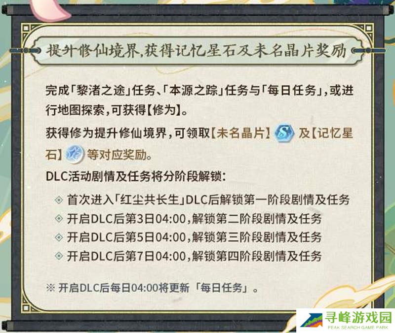 完成「黎渚之途」任务、「本源之踪」任务与「每日任务」,或进行地图探索,可获得【修为】。获得修为提升修仙境界,可领取【未名晶片】及【记忆星石】等对应奖励。