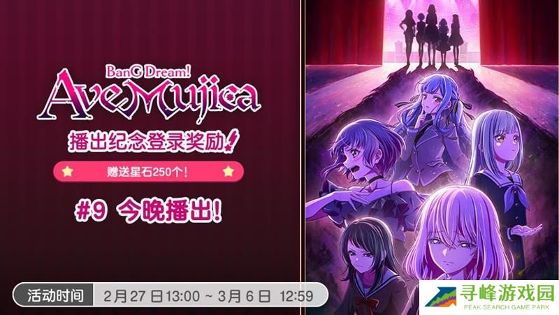 此外,为庆祝《BanG Dream! Ave Mujica/颂乐人偶》动画的播出,游戏内还同步开展了登录奖励活动。自2025年1月9日起,每周随着动画的播出,玩家登录游戏即可领取「星石×250」的奖励。