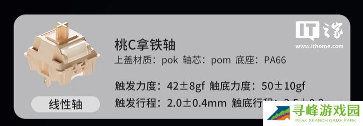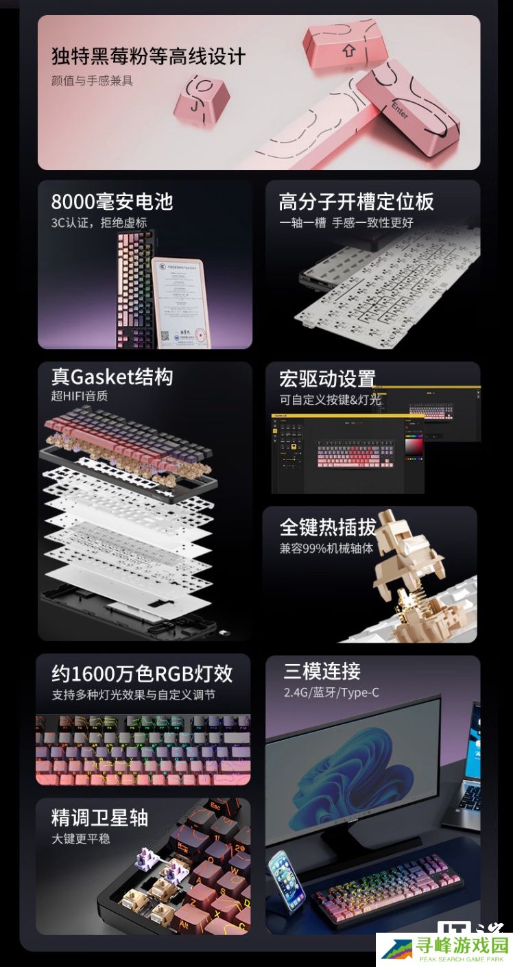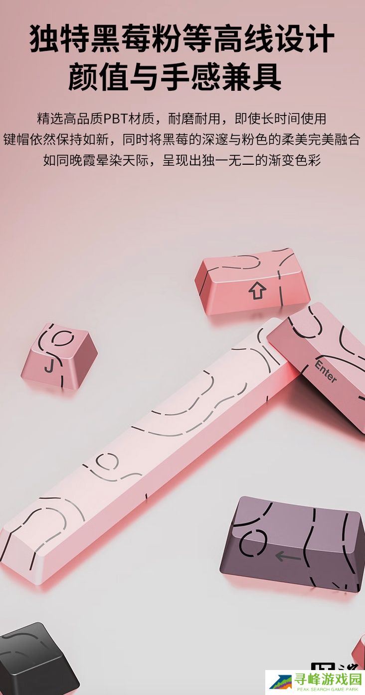 该键盘使用 Gasket结构多层填充内胆,目前上市这一“黑莓粉渐变等高线”版本号称进行填充升级“手感更软弹,杜绝空腔音”,键盘搭载“桃 C 拿铁轴”,配备PBT粉紫色键帽,支持全键热插拔、全键无冲。