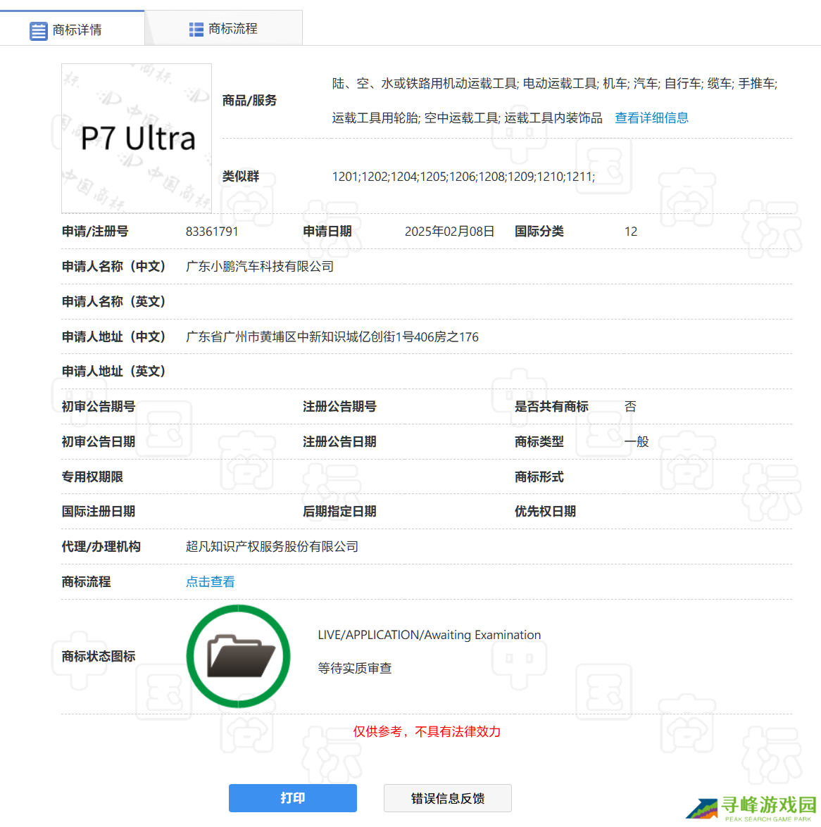 值得一提的是,广东小鹏汽车科技有限公司于 2 月 8 日申请了“P7 Ultra”的商标,国际分类为运输工具,当前商标状态为等待实质审查。