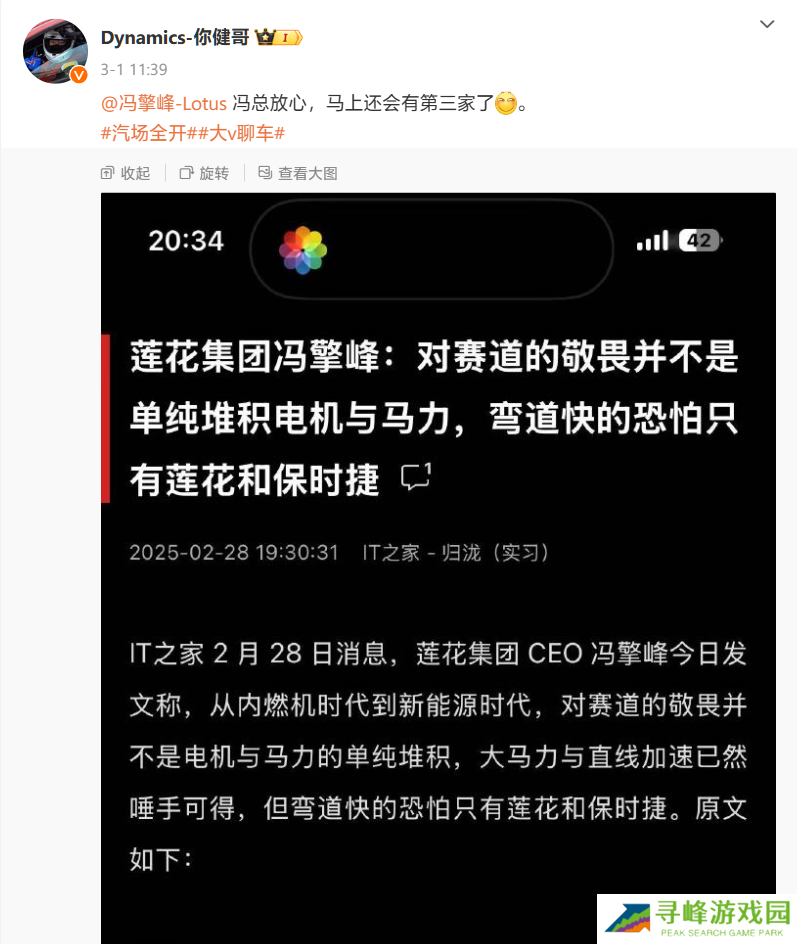2 月 28 日,莲花集团 CEO 冯擎峰发文称:对赛道的敬畏并不是单纯堆积电机与马力,弯道快的恐怕只有莲花和保时捷。不久后,小鹏汽车动态体验产品总监“Dynamics-你健哥”在微博上喊话冯擎峰:“冯总放心,马上会有第三家了。”