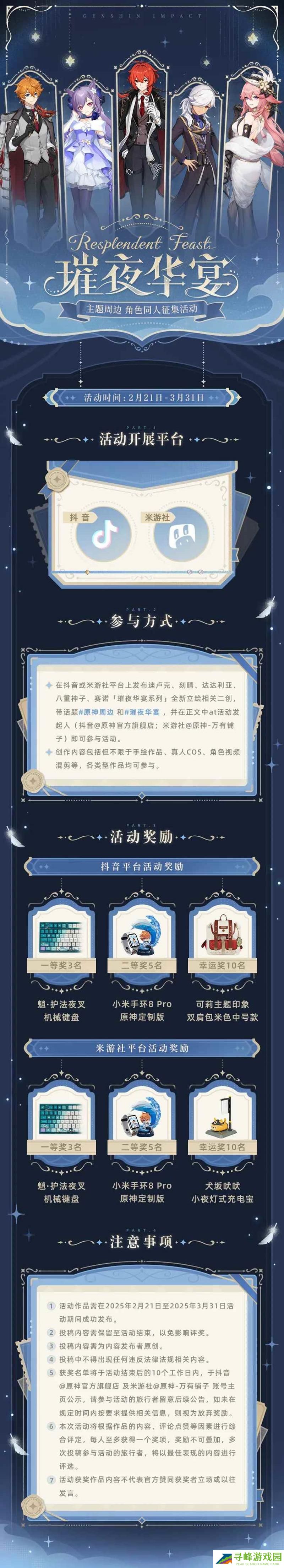 在抖音或米游社发布迪卢克、刻晴、达达利亚、八重神子、赛诺「璀夜华宴系列」全新立绘相关二创,带话题#原神周边 和#璀夜华宴 ,并在正文中at活动发起人(抖音@原神官方旗舰店;米游社@原神-万有铺子),即视为参与活动。