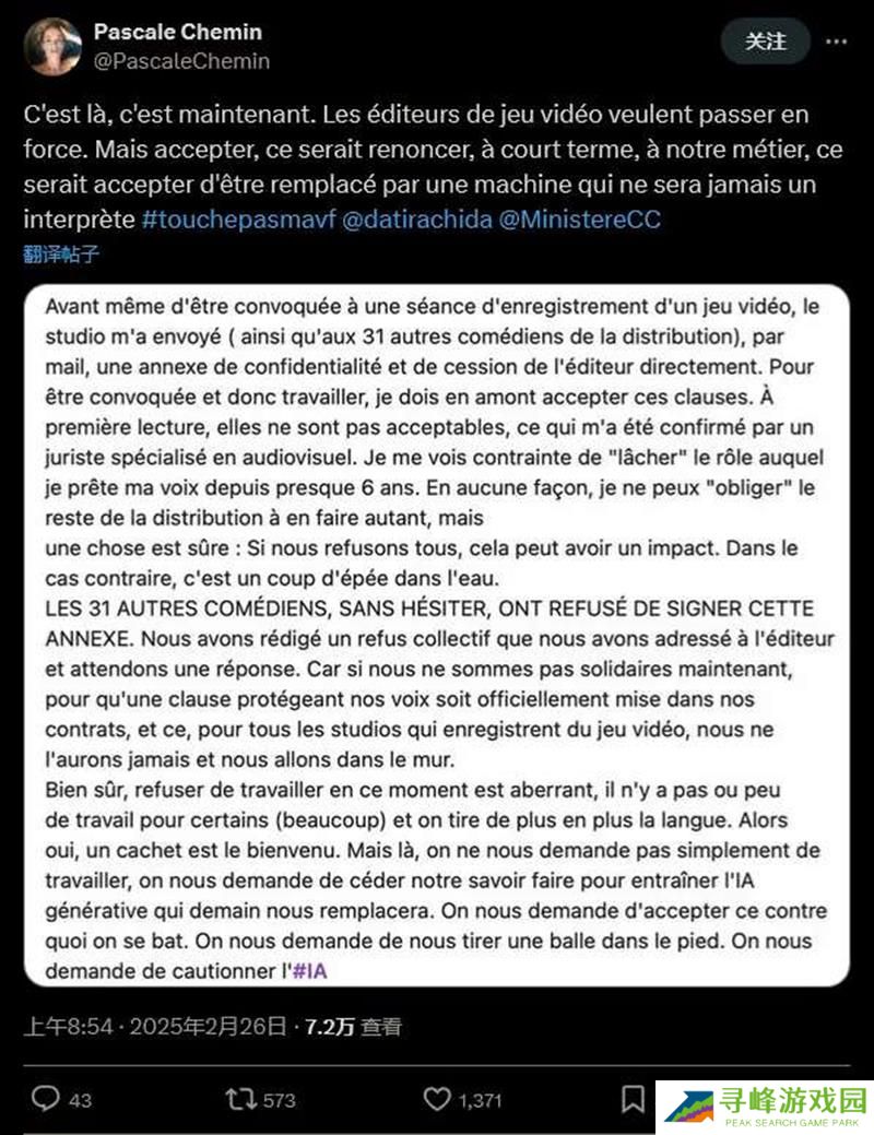 《Apex英雄》中角色“恶灵”的法语配音演员 Pascale Chemin 近日在社交媒体上曝光了一起行业争议事件。据她透露,她与另外 31 名配音演员收到了来自游戏发行商 EA 的一份强制性协议,要求他们允许自己的声音被用于训练 AI。这一要求引发了配音演员们的强烈不满和抵制。
