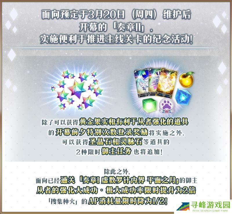《命运冠位指定》(FGO国服)即将迎来奏章II开幕前夕纪念活动。面向预定于2025年3月20日(周四)维护后开幕的「奏章II」,实施各种各样举措的『「奏章II」开幕前夕纪念活动』举办!为「奏章II」的开幕做准备,活用本次纪念活动推进主线关卡!