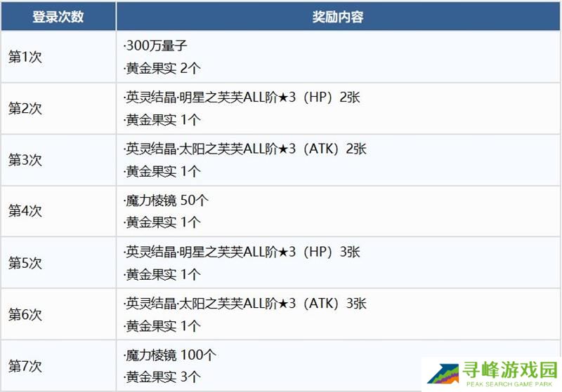 从2月28日周五4点到3月14日周五3点59分,只要在规定时间内登录7次,就能获得包含10个黄金果实、5张英灵结晶明星之芙芙ALL阶3星HP、5张英灵结晶太阳之芙芙ALL阶3星ATK、150个魔力棱镜和300万量子在内的豪华奖励。
