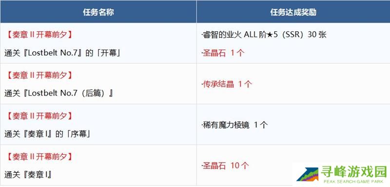 在上述时间段内,御主任务的限定栏中将追加主线关卡进度任务和Lostbelt No.7、奏章I开始及通关任务。完成所有任务后,可累计获得200个魔力棱镜、2个稀有魔力棱镜、70张睿智的业火ALL阶5星SSR、1个传承结晶和30个圣晶石。