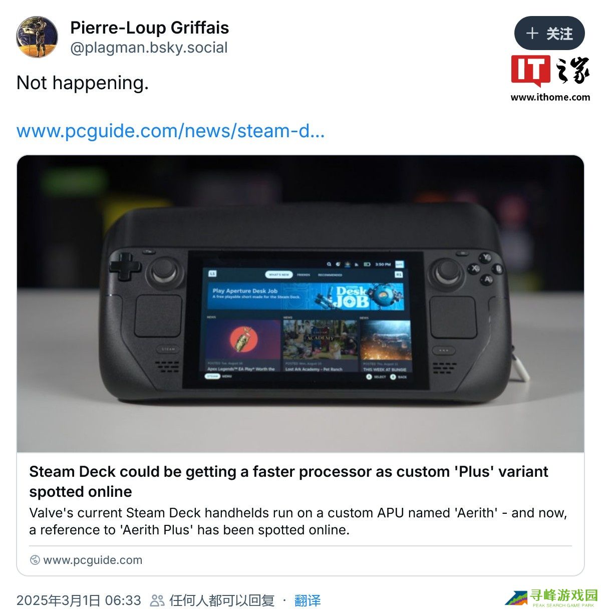 V社Steam Deck 团队员工 Pierre-Loup Griffais 在 Bluesky 平台表示,Valve 并未在开发基于 "Aerith Plus" 的 Steam Deck 掌机改款(此前已有基于 6nm "Sephiroth" SoC 的 Steam Deck OLED)。