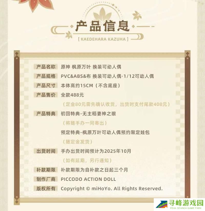 该可动人偶的预售将于2025年3月3日晚上8点正式开启,并持续至4月7日晚上11点59分。在预售期间,玩家支付定金80元,不仅可以锁定心仪的人偶,还能获赠枫原万叶可动人偶预约限定娃包,数量有限,先到先得。