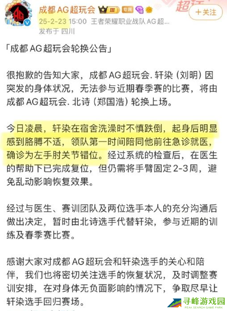 AG超玩会这边是轩染在宿舍洗澡时不慎跌倒,起身后明显感到胳膊不适,领队第一时间陪同他前往急诊就医确诊为左手肘关节错位。经过系统的检查后,在医生的帮助下已完成复位,但仍需将手臂固定2-3周,避免乱动影响恢复效果。