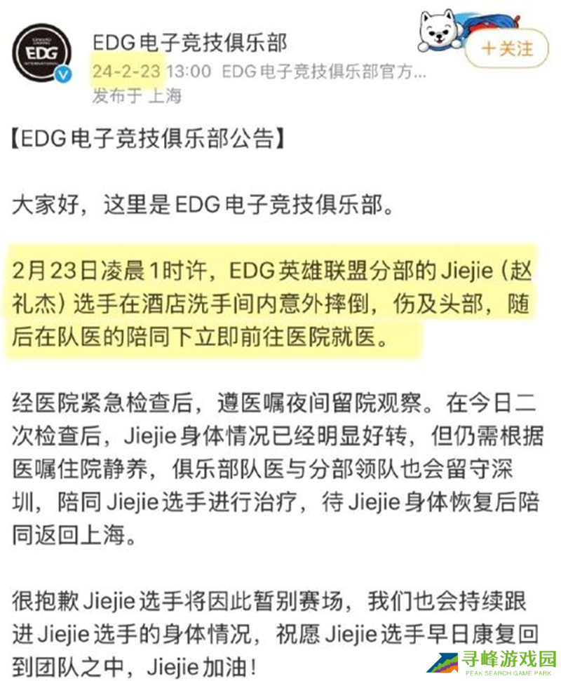 而EDG这边是:2月23日凌晨1时许,EDG英雄联盟分部的Jiejie(赵礼杰)选手在酒店洗手间内意外摔倒,伤及头部,随后在队医的陪同下立即前往医院就医。