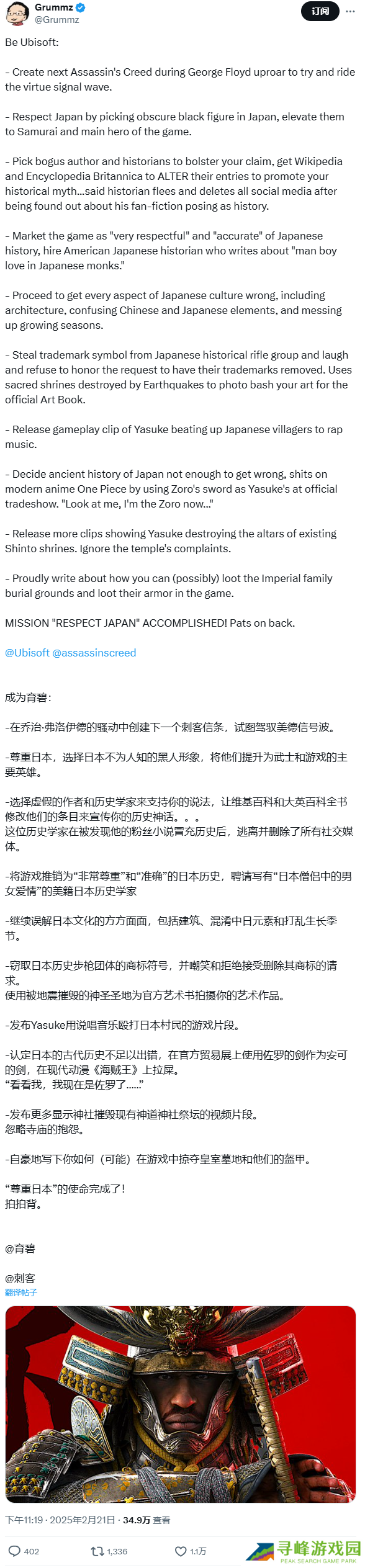 本站 2 月 24 日消息,玩家 @ALIAS 2 月 20 日在 X 上指出,育碧在《刺客信条:影》中多处设计有违历史,甚至是“文化侮辱”“历史亵渎”。