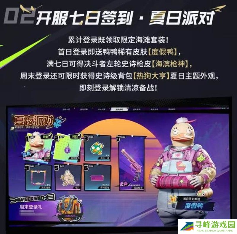 累计登录既领取限定海滩套装!首日登录即送鸭鸭稀有皮肤【度假鸭】,满七日可得决斗者左轮史诗枪皮【海滨枪神】,周末登录还可限时获得史诗级背包【热狗大亨】夏日主题外观,即刻登录解锁清凉备战!