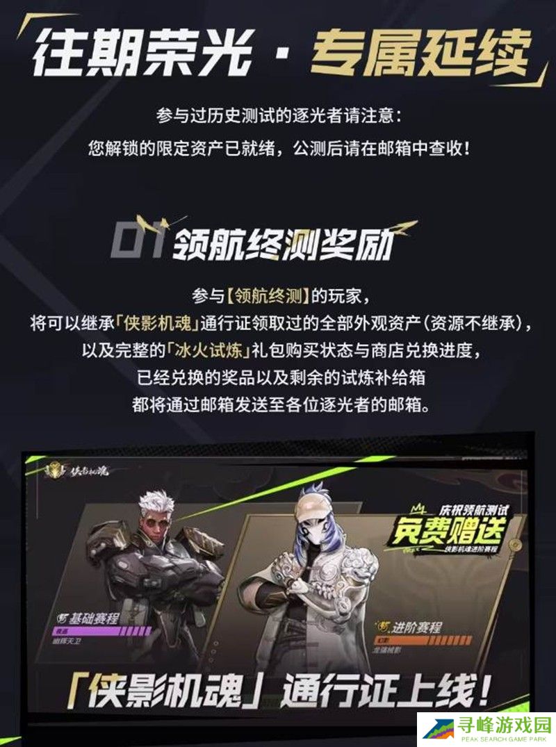 参与【领航终测】的玩家,将可以继承「领航机魂」通行证领取过的全部外观资产(资源不继承),以及完整的「冰火试炼」礼包购买状态与商店兑换进度,已经兑换的奖品以及剩余的试炼补给箱,都将通过邮箱发送至各位逐光者的邮箱。