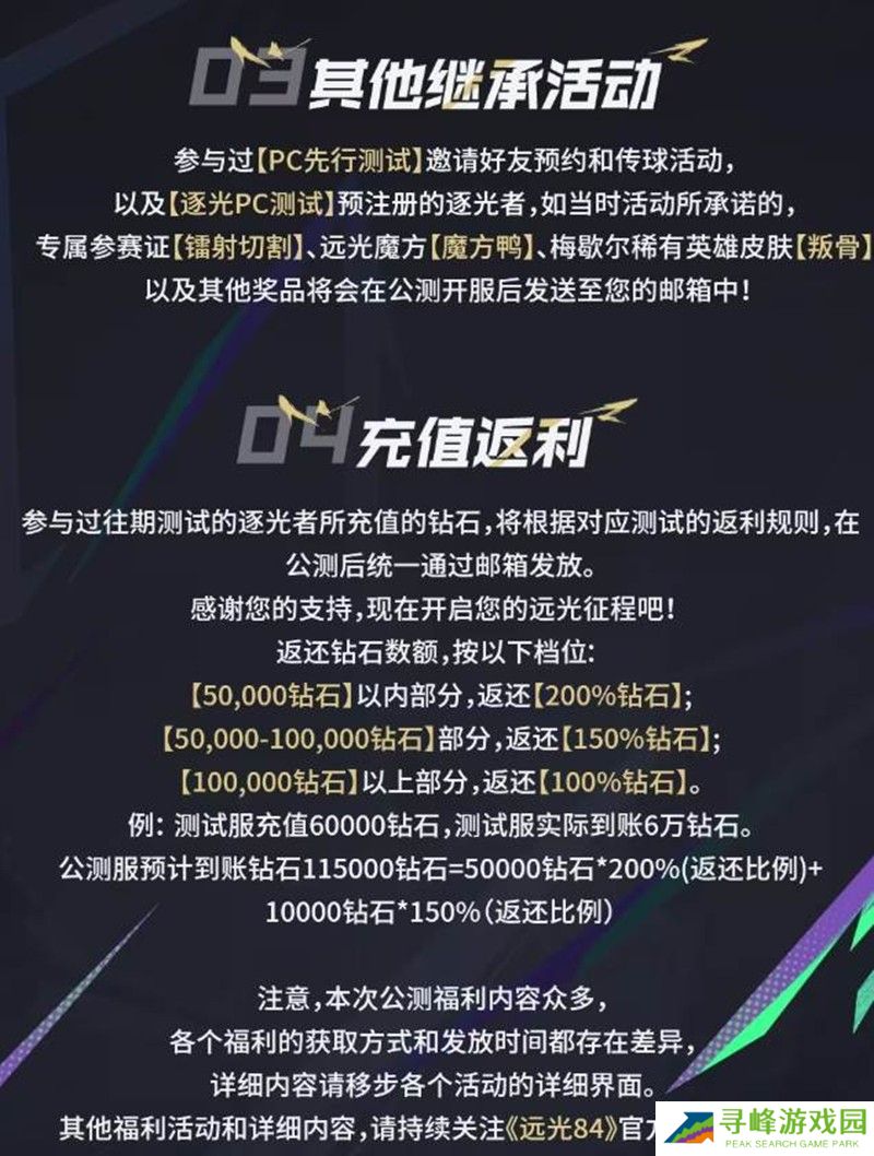 参与过往期测试的逐光者所充值的钻石,将根据对应测试的返利规则,在公测后统一通过邮箱发放。感谢您的支持,现在开启您的远光征程吧!