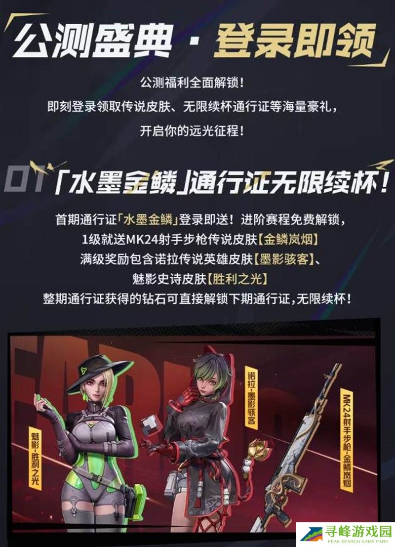 《远光84》公测期间,玩家登录游戏即可领取传说皮肤、无限续杯通行证等海量豪礼。首期通行证“水墨金鳞”登录即送,进阶赛程免费解锁,1级就送MK24射手步枪传说皮肤【金鳞岚烟】,满级奖励包含诺拉传说英雄皮肤【墨影骇客】、魅影史诗皮肤【胜利之光】。整期通行证获得的钻石可直接解锁下期通行证,无限续杯!