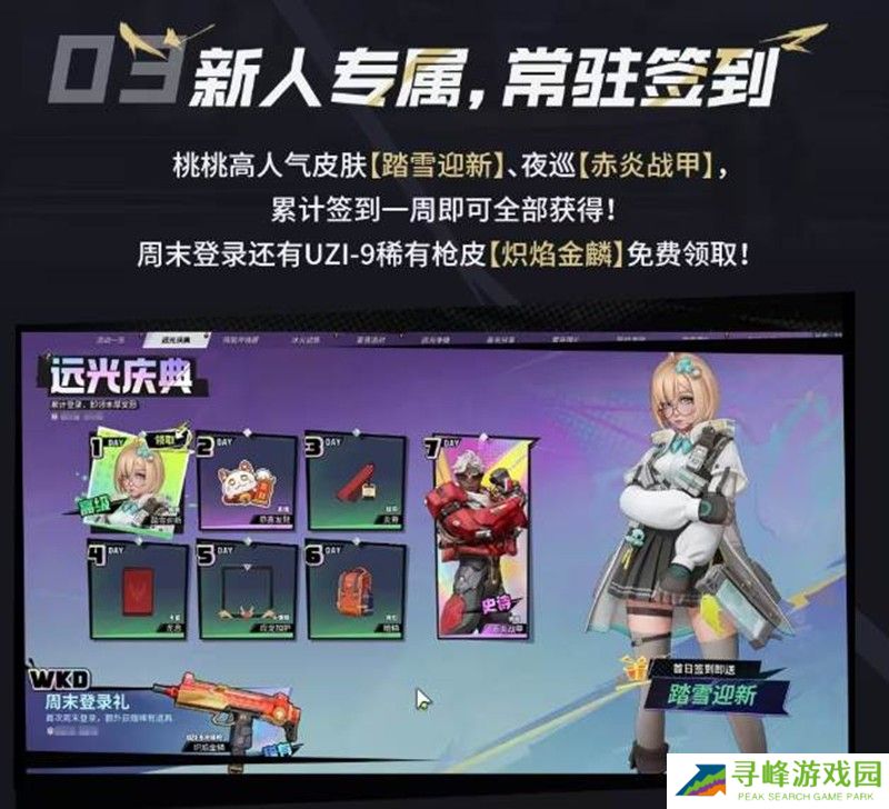 桃桃高人气皮肤【踏雪迎新】、夜巡【赤炎战甲】,累计签到一周即可全部获得!周末登录还有UZI-9稀有枪皮【炽焰金鳞】免费领取!