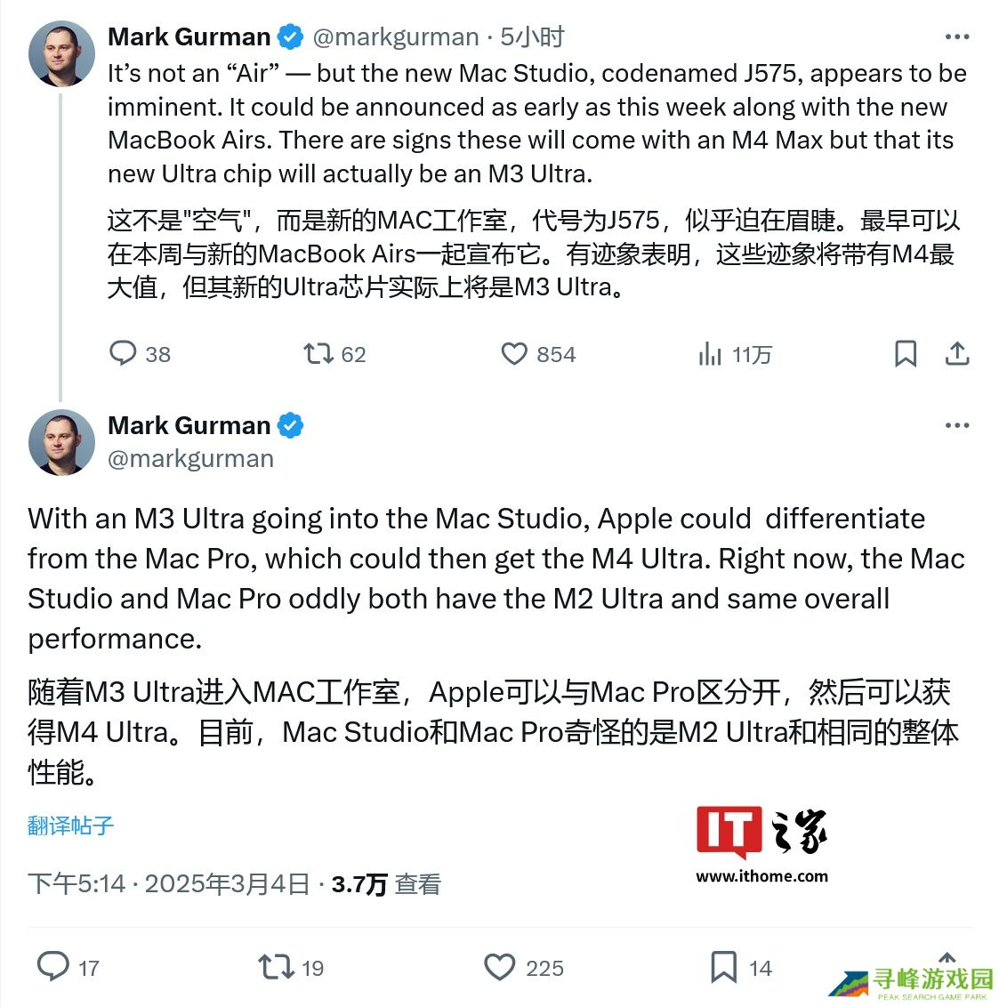 本站 3 月 5 日消息,彭博社记者马克・古尔曼(Mark Gurman)今天(3 月 5 日)在 X 平台发布推文,曝料称苹果将于本周推出新款 Mac Studio。古尔曼表示新款 Mac Stud