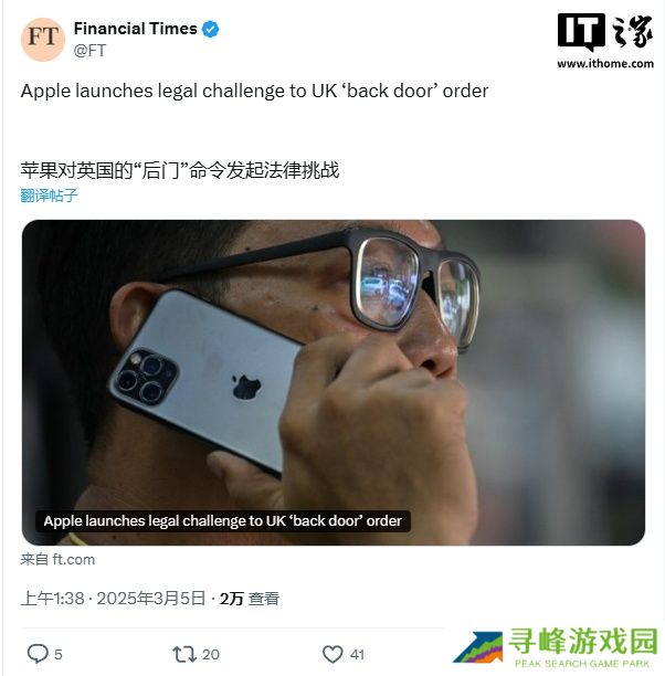 本站 3 月 5 日消息,《金融时报》今日报道称,苹果公司已向英国调查权力法庭提交法律申诉,试图推翻英国政府对加密数据后门访问的要求。今年早些时候,英国政府要求苹果为其创建后门,从而为其秘密提供全球