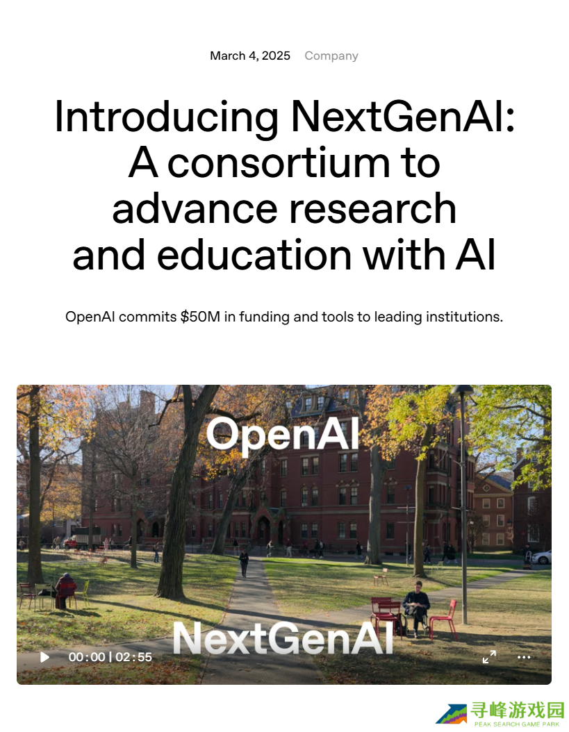 本站 3 月 4 日消息,北京时间今晚,OpenAI 宣布启动 NextGenAI 项目,这是一项由 15 个顶尖研究机构组成的创新联盟,旨在利用人工智能推动科研突破和教育的变革。本站从官方公告获悉,