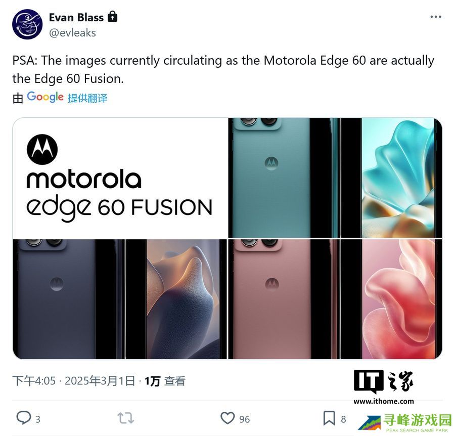 本站 3 月 2 日消息,消息源 Evan Blass(@evleaks)昨日(3 月 1 日)在 X 平台发布推文,分享了摩托罗拉 Edge 60 Fusion 手机的高清渲染图,采用曲面屏和极窄边