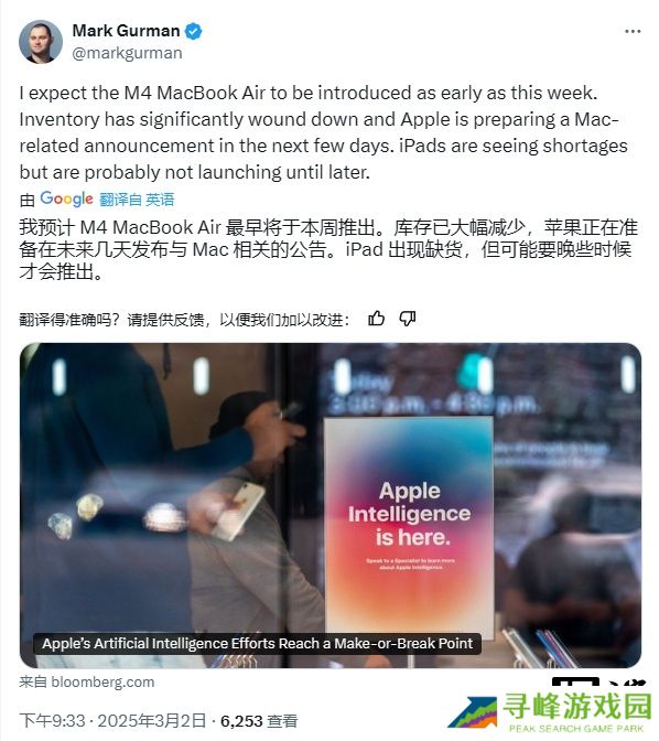 本站 3 月 2 日消息,据彭博社记者马克・古尔曼(Mark Gurman)当地时间周日透露,苹果公司计划最早于本周推出搭载 M4 芯片的 13 英寸和 15 英寸 MacBook Air 新品。本站