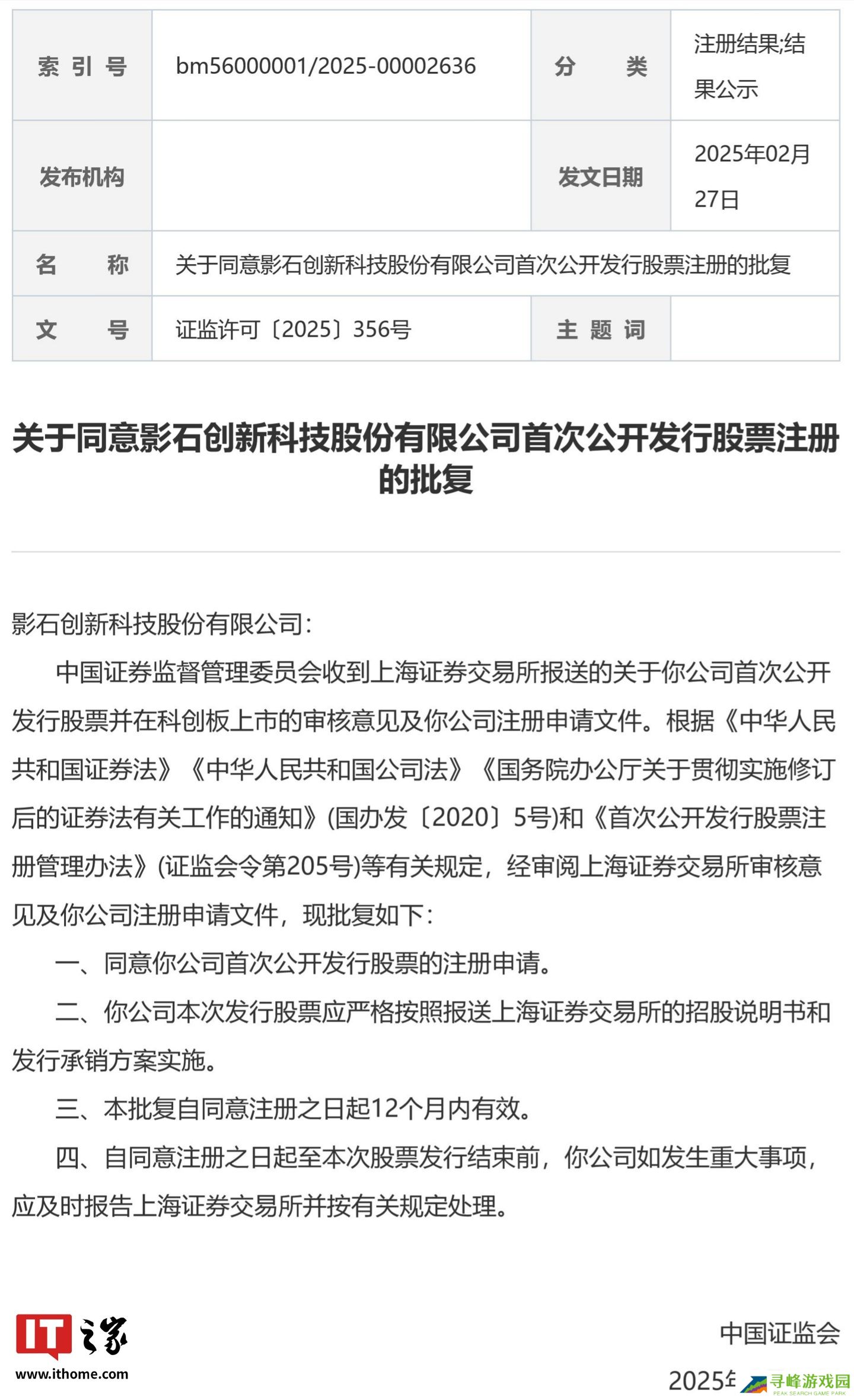 感谢本站网友 zerodert、刺客 的线索投递! 本站 2 月 28 日消息,中国证监会官网昨日(2 月 27 日)发布公告,在《关于同意影石创新科技股