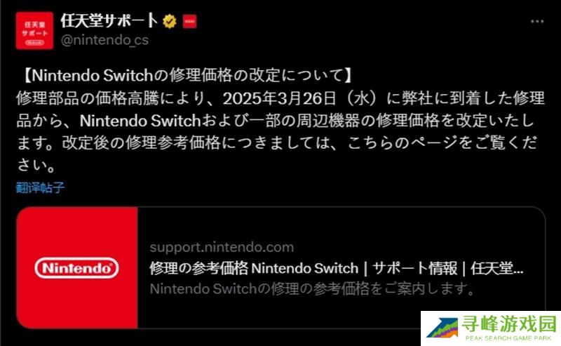 任天堂上调switch1代维修价格 单件费用上涨54元