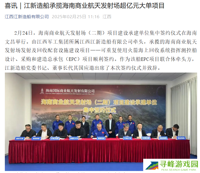 本站 2 月 26 日消息,江西江新造船有限公司昨日宣布,海南商业航天发射场(二期)项目建设承建单位集中签约仪式 2 月 24 日在海南文昌举行。由该公司牵头,承揽的海南商业航天发射场发射及回收配套设