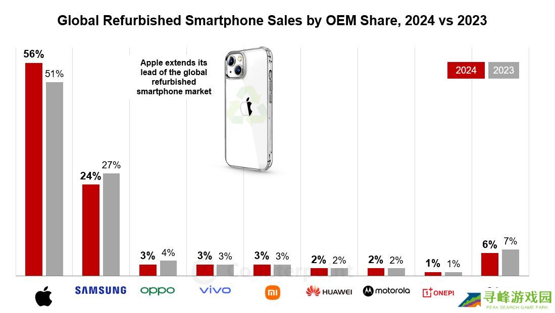 本站 2 月 25 日消息,市场调查机构 CounterPoint Research 昨日(2 月 24 日)发布博文,报告称 2024 年全球翻新智能手机销量机市场持续增长 5%,苹果进一步巩固了其