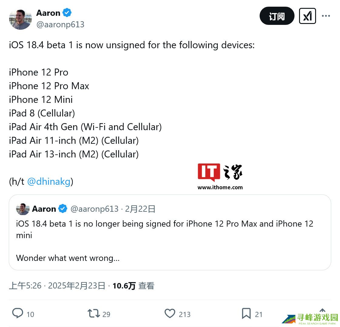 本站 2 月 25 日消息,科技媒体 MacRumors 昨日(2 月 24 日)发布博文,报道称由于导致存在“循环重启 变砖” BUG,苹果公司已暂停向部分 iPhone 和 iPad 机型验证