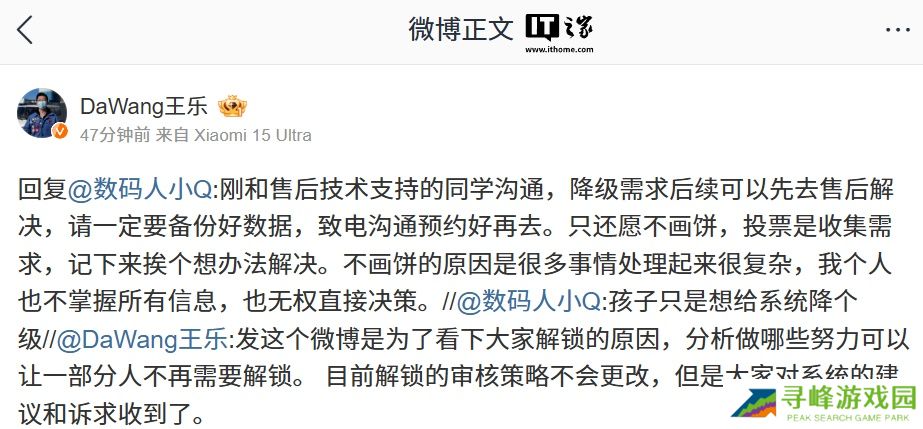 本站 2 月 24 日消息,小米公司应用软件部总监王乐今日发文称:“刚和售后技术支持的同学沟通,降级需求后续可以先去售后解决,请一定要备份好数据,致电沟通预约好再去。”王乐还针对此前发起 BL 解锁投