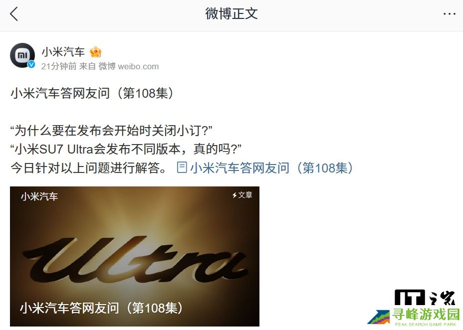 感谢本站网友 Autumn_Dream、小爰同学 的线索投递! 本站 2 月 24 日消息,小米汽车官方今日发布答网友问(第 108 集),就 SU7 U