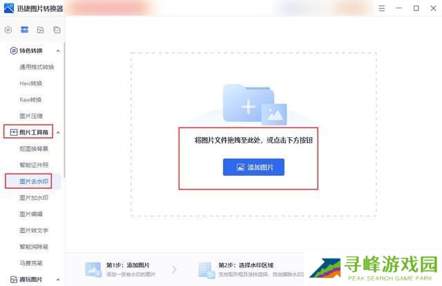 第一步:打开软件后,点击【图片工具箱】下的【图片去水印】功能,接着使用【添加图片】将需要去除水印的图片添加进软件中。