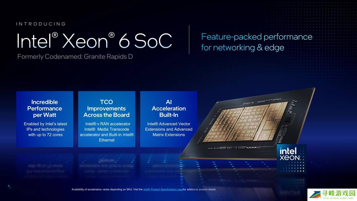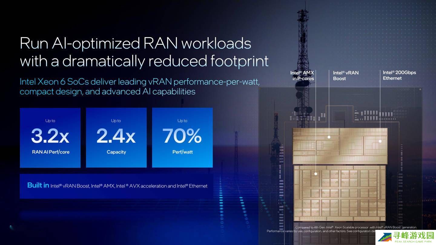 至强6 SoC方面,英特尔在I/O芯片中集成了多种专用知识产权(IP),包括vRAN Boost、200Gbps以太网以及媒体转码加速器。结合CPU核心中的AMX技术,这些特性使得至强6 SoC能够更好地应对边缘计算和网络领域不断变化的工作负载需求。
