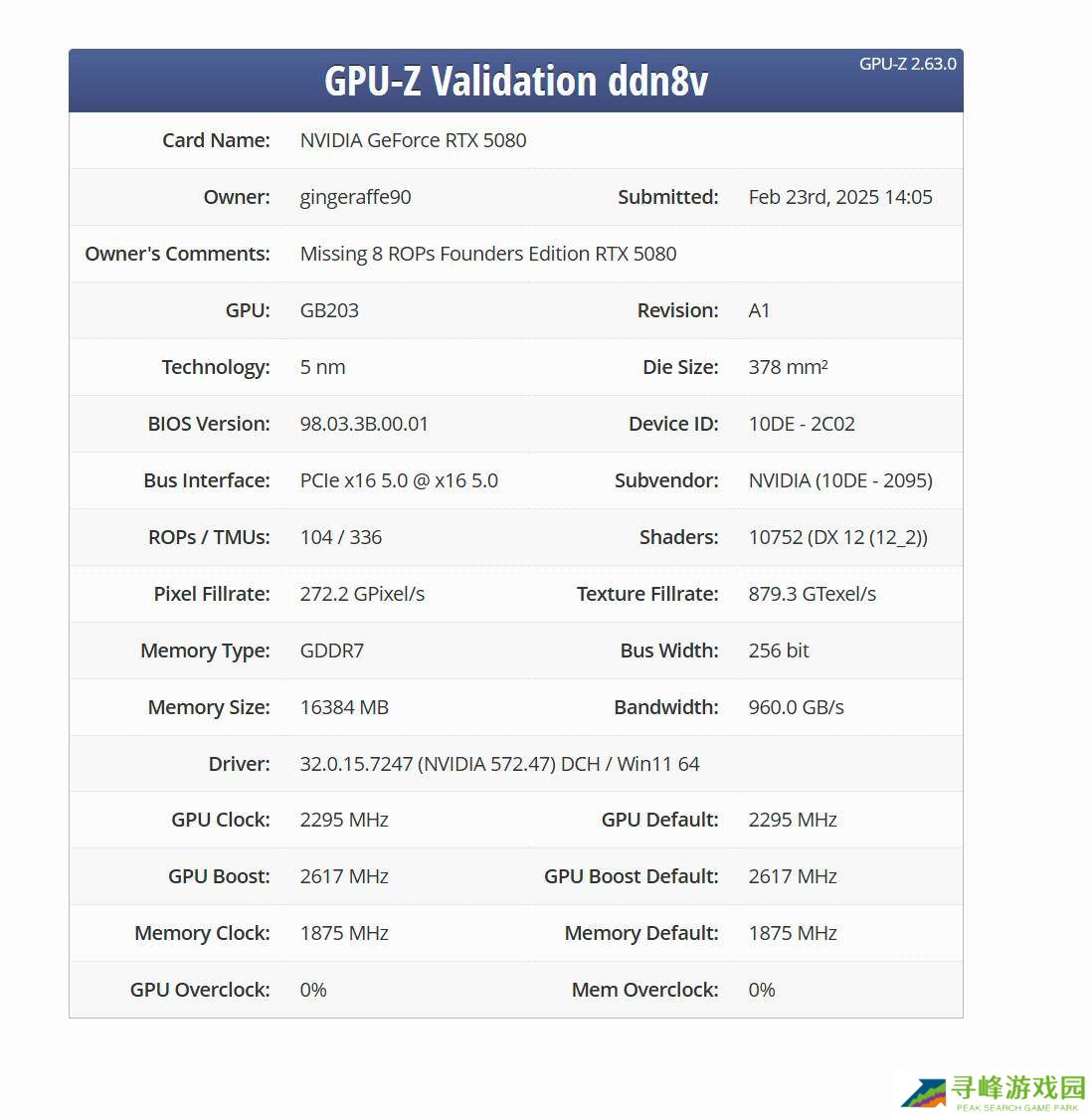 一位Reddit网友gingeraffe90近日发帖称,他购买的GeForce RTX 5080 FE显卡在GPU-Z软件中显示仅包含104个ROPs,这比英伟达官方公布的112个ROPs少了一组8个。这一缺失规模与之前曝光的RTX 5090和5070 Ti案例中的情况一致。